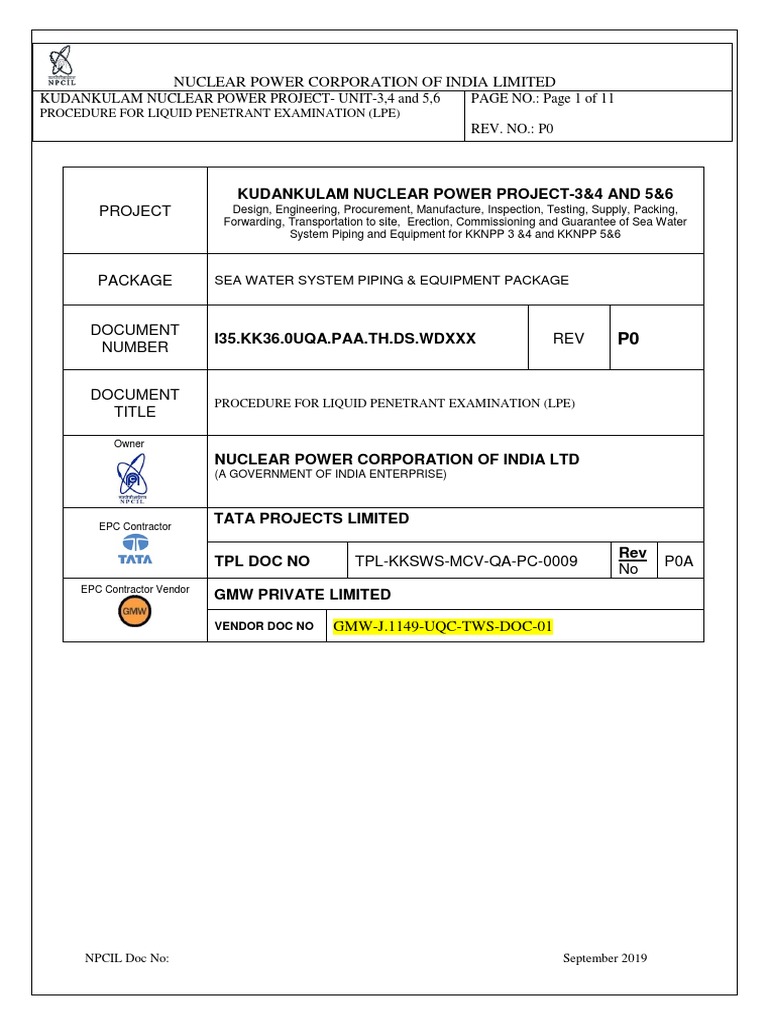 Title of the Document: PROCEDURE FOR LIQUID PENETRANT EXAMINATION (LPE)