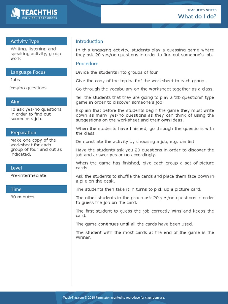 speaking activity, group they ask 20 yes/no questions in order to find out someone's job.
