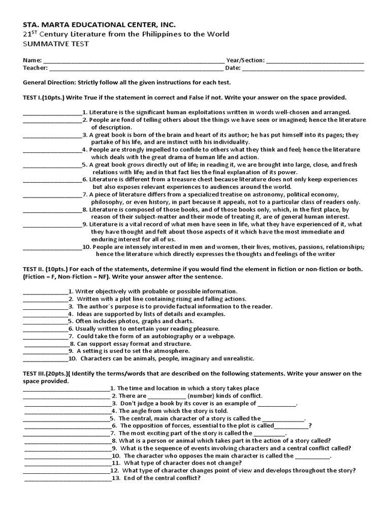 TEST II. (10pts.) For each of the statements, determine if you would find the element in fiction or non‐fiction or both.