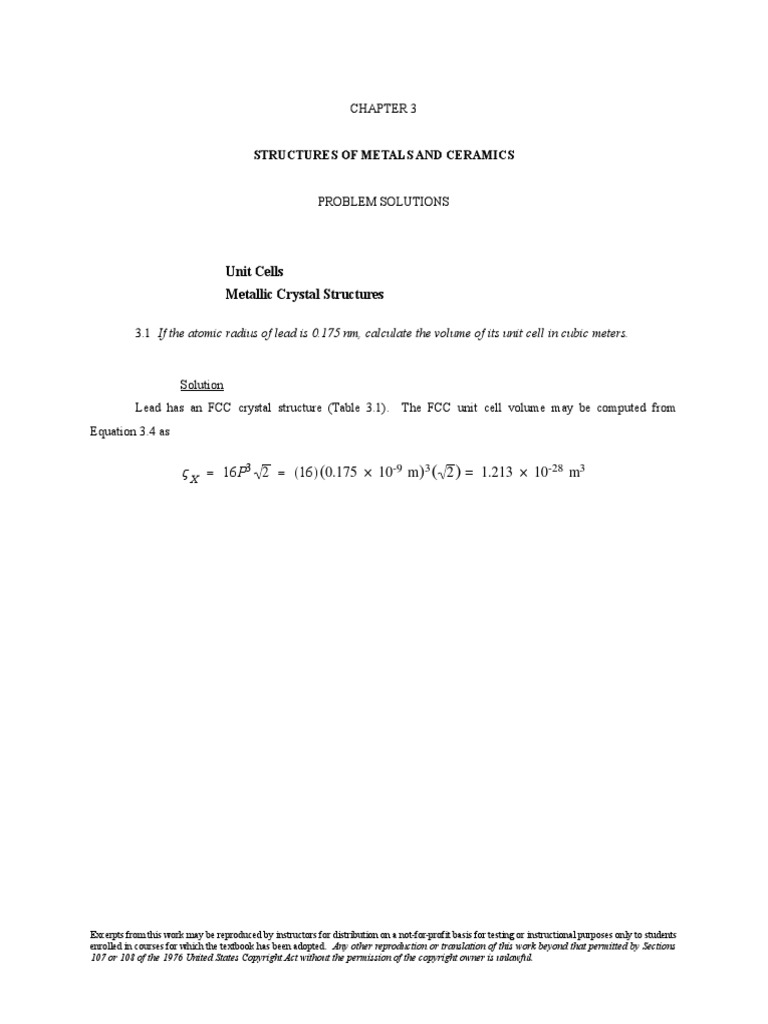 3.1 If the atomic radius of lead is 0.175 nm, calculate the volume of its unit cell in cubic meters.