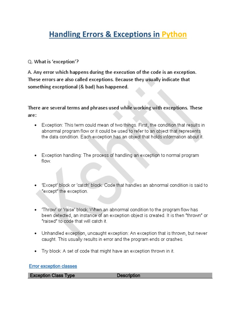 execution. These are like ZeroDivisionError, NameError, TypeError, ValueError,