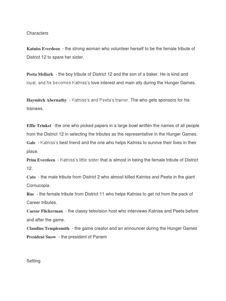 searching food for her family, was picked to be the male tribute of District 12. Katniss