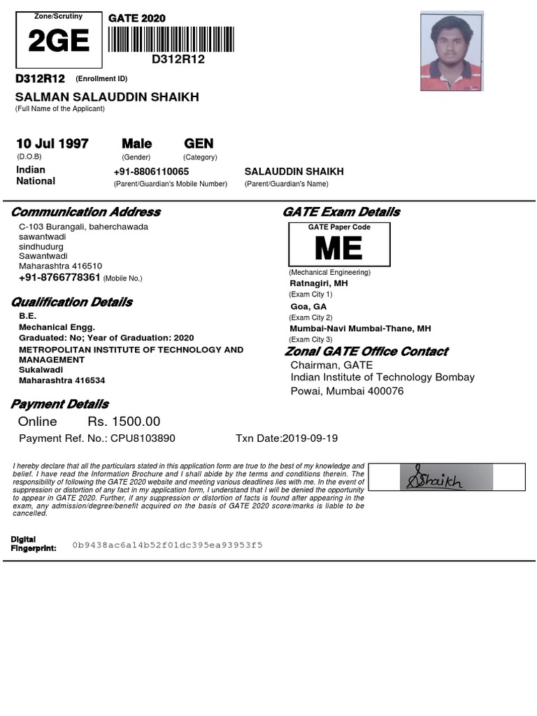 responsibility of following the GATE 2020 website and meeting various deadlines lies with me. In the event of