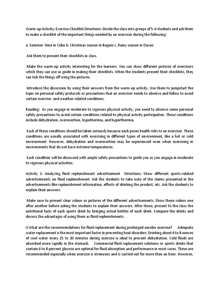 Warm-up Activity: Exercise Checklist Directions: Divide the class into groups of 5-6 students and ask them