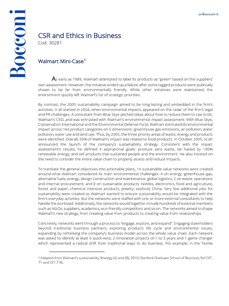 1Adapted from Walmart’s sustainability Strategy (A) and (B), 2010, Stanford Graduate School of Business, Ref OIT-
