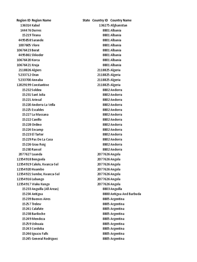 Region ID Region Name State Country ID Country Name