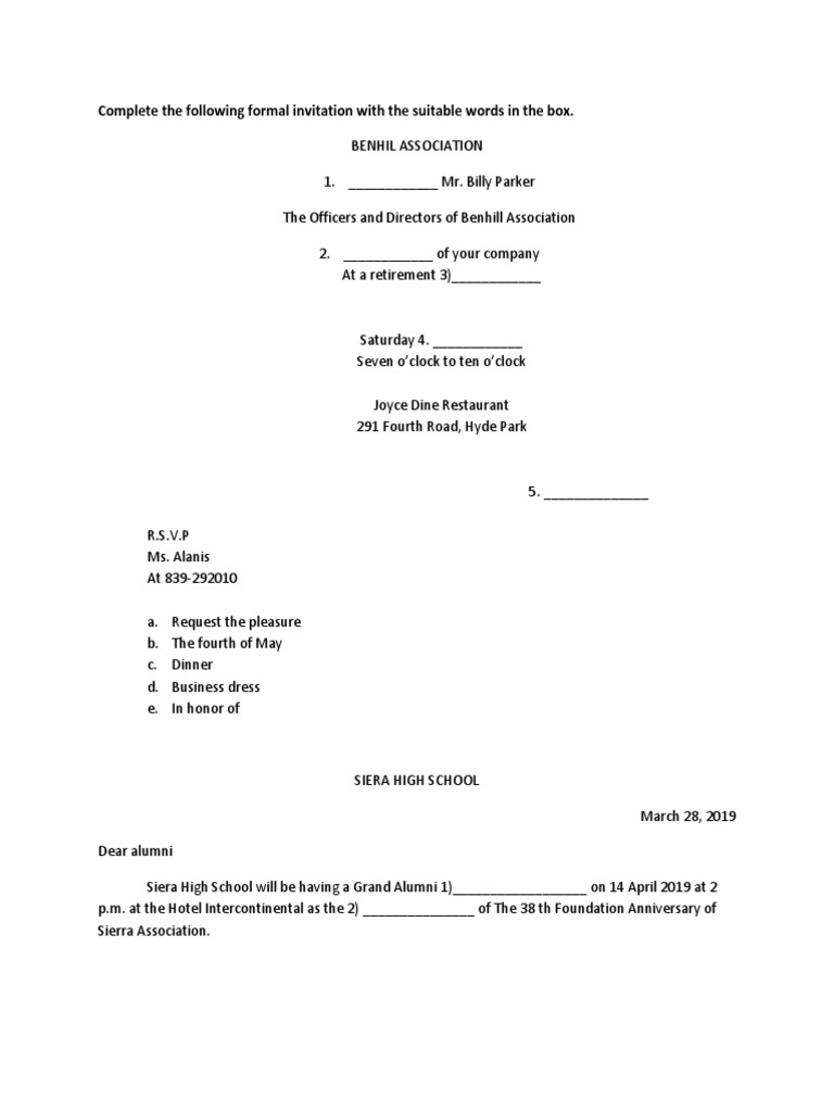 Siera High School will be having a Grand Alumni 1)__________________ on 14 April 2019 at 2