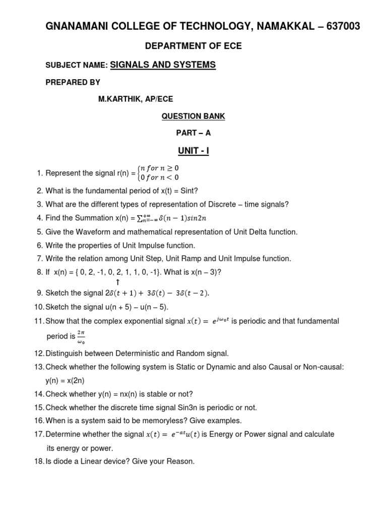 SUBJECT NAME: SIGNALS AND SYSTEMS