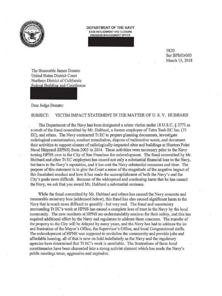 Hubbard and others at HPNS is consequential, and continues to be assessed. The Navy awarded