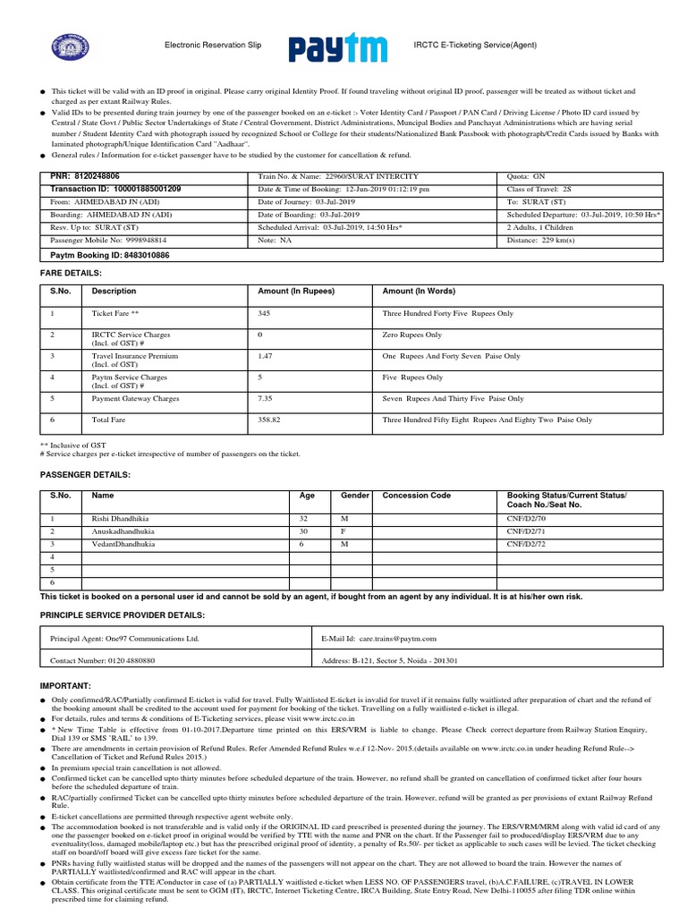 Resv. Up to: SURAT (ST) Scheduled Arrival: 03-Jul-2019, 14:50 Hrs* 2 Adults, 1 Children