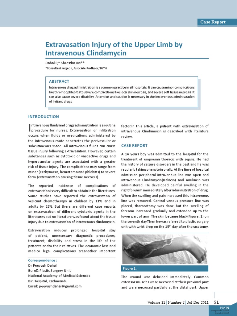 Extravasation Injury of the Upper Limb by Intravenous Clindamycin