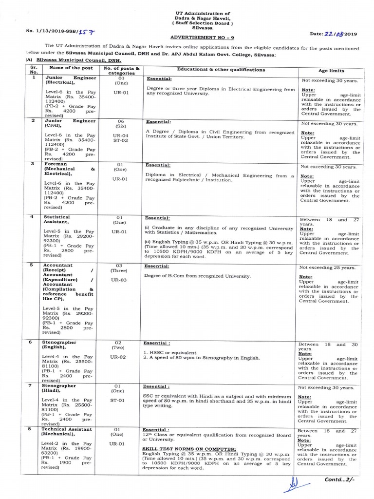POSTS ADVERTISED FOR SILVASSA MIINICIPAL COUNCIL