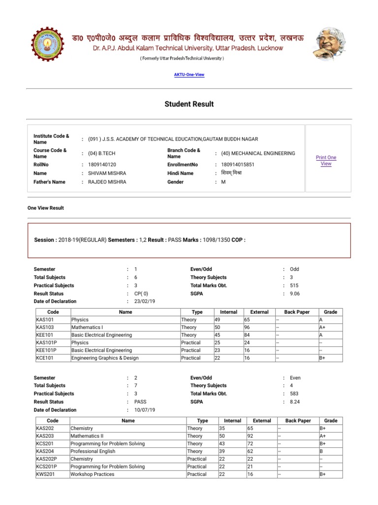 Session : 2018-19(REGULAR) Semesters : 1,2 Result : PASS Marks : 1098/1350 COP :