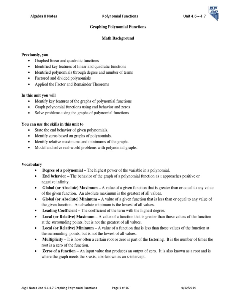 • What does a polynomial function look like? How do I identify the zeros and the end behavior?
