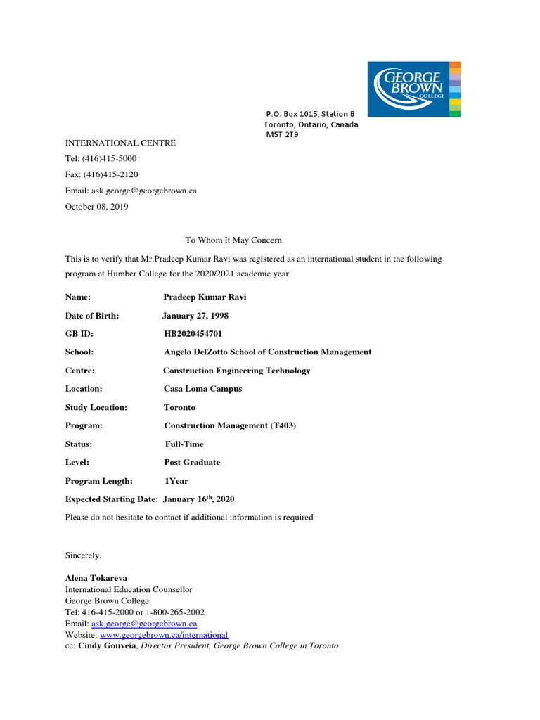 cc: Cindy Gouveia, Director President, George Brown College in Toronto