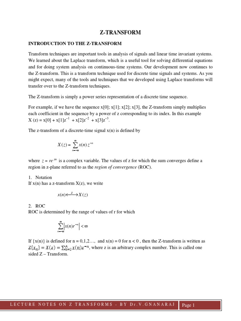 RE NOTES ON Z TRANSFORMS - BY Dr.V.GNANARAJ Page 1