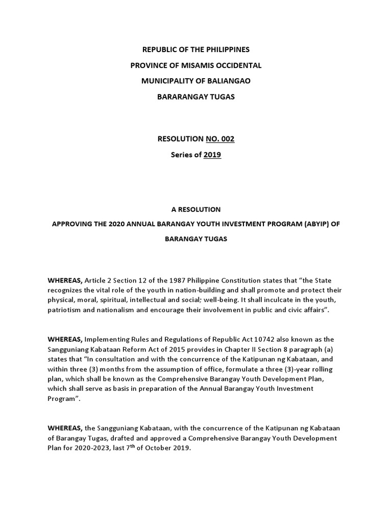 WHEREAS, the Sangguniang Kabataan of Barangay Tugas has prepared the 2020 Annual