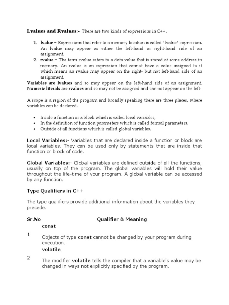 Lvalues and Rvalues:- There are two kinds of expressions in C++.