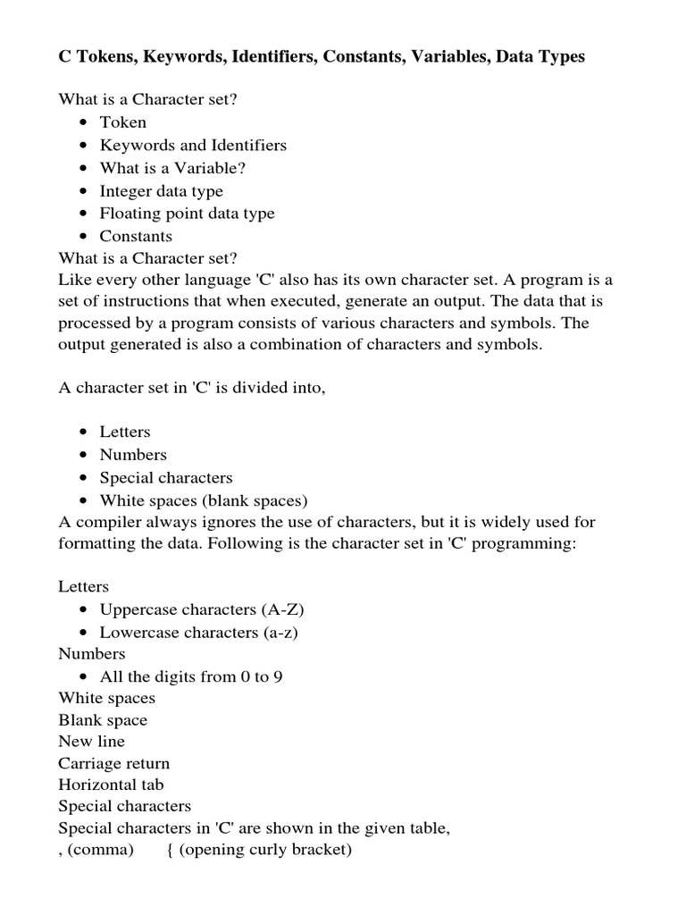C Tokens, Keywords, Identifiers, Constants, Variables, Data Types