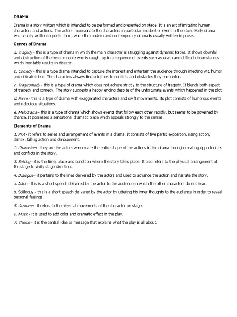 1. Plot - it refers to series and arrangement of events in a drama. It consists of five parts: exposition, rising action,
