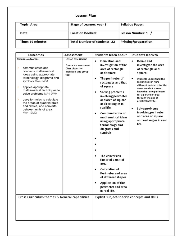 Topic: Area Stage of Learner: year 8 Syllabus Pages: