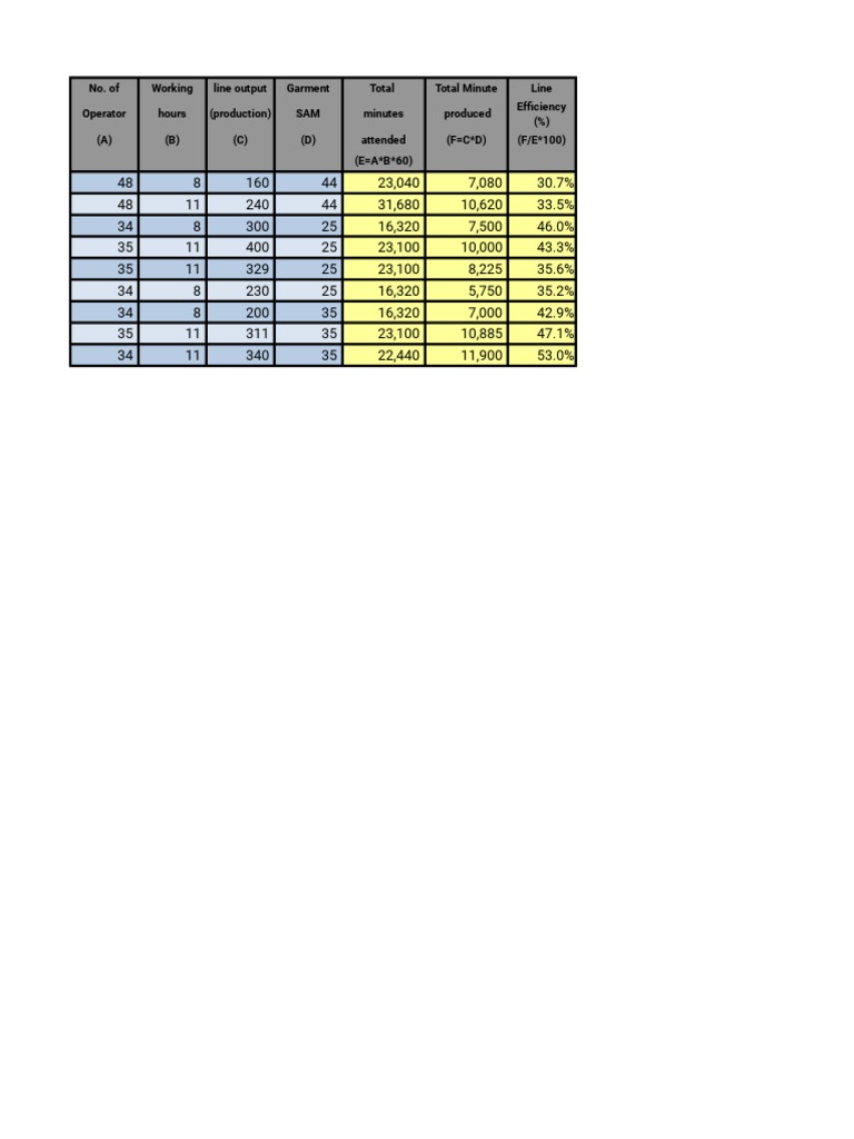 of Working line output Garment Total Total Minute Line