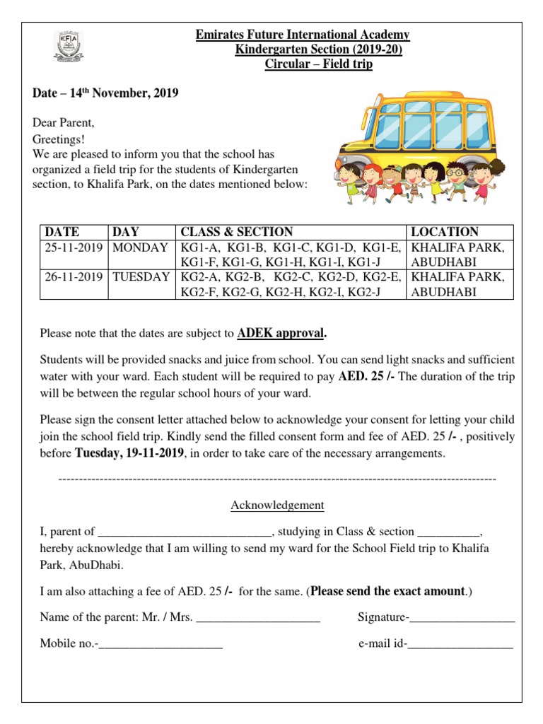join the school field trip. Kindly send the filled consent form and fee of AED. 25 /- , positively