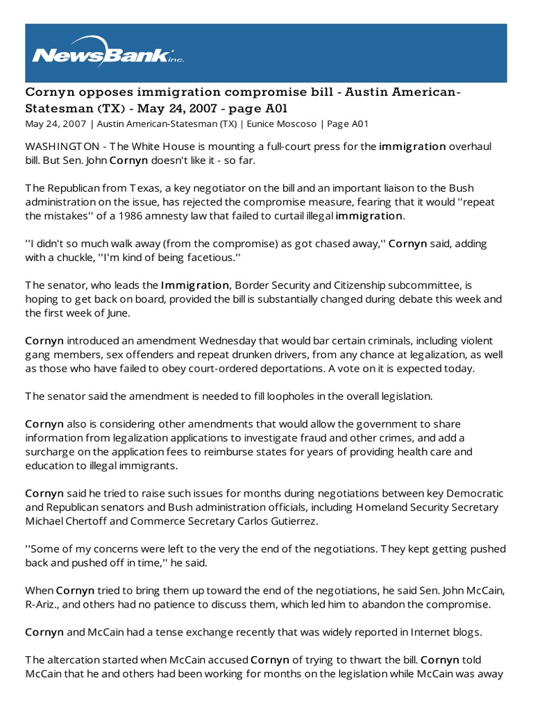 Cornyn Opposes Immigration Compromise Bill Austin American-Statesman TX May 24 2007 PA01