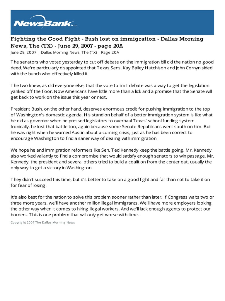 Fighting The Good Fight Bush Lost On Immigration Dallas Morning News The TX June 29 2007 P20a