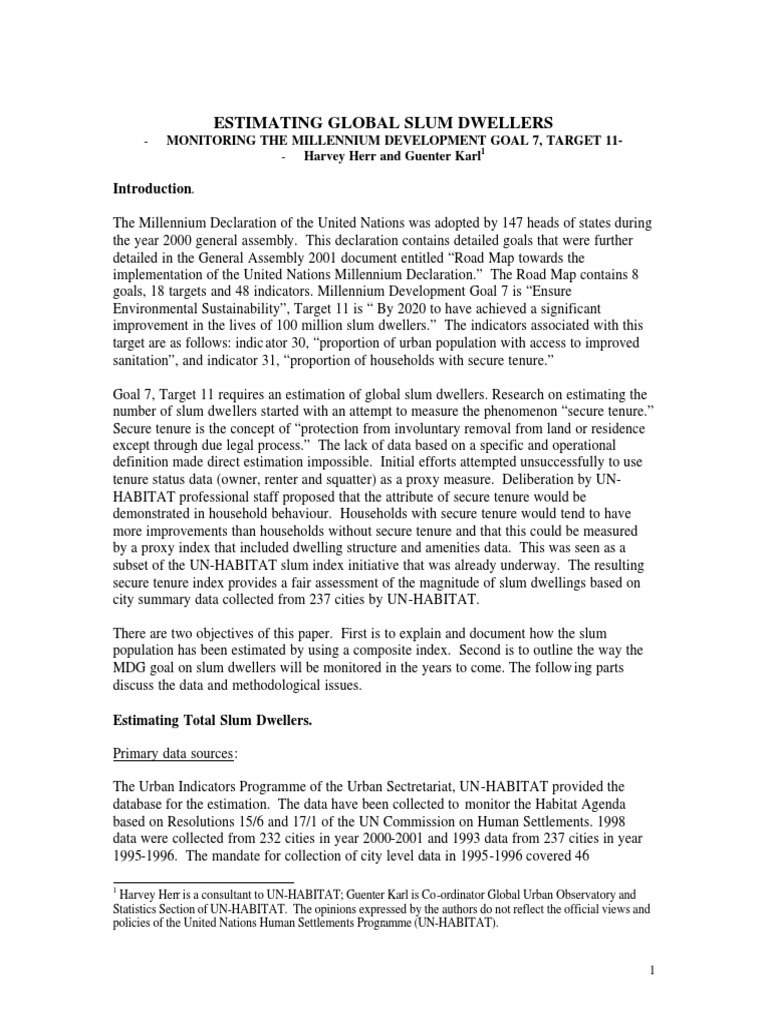 Goal 7, Target 11 requires an estimation of global slum dwellers. Research on estimating the