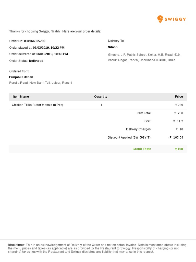 Order placed at: 06/03/2019, 10:22 PM Nilabh