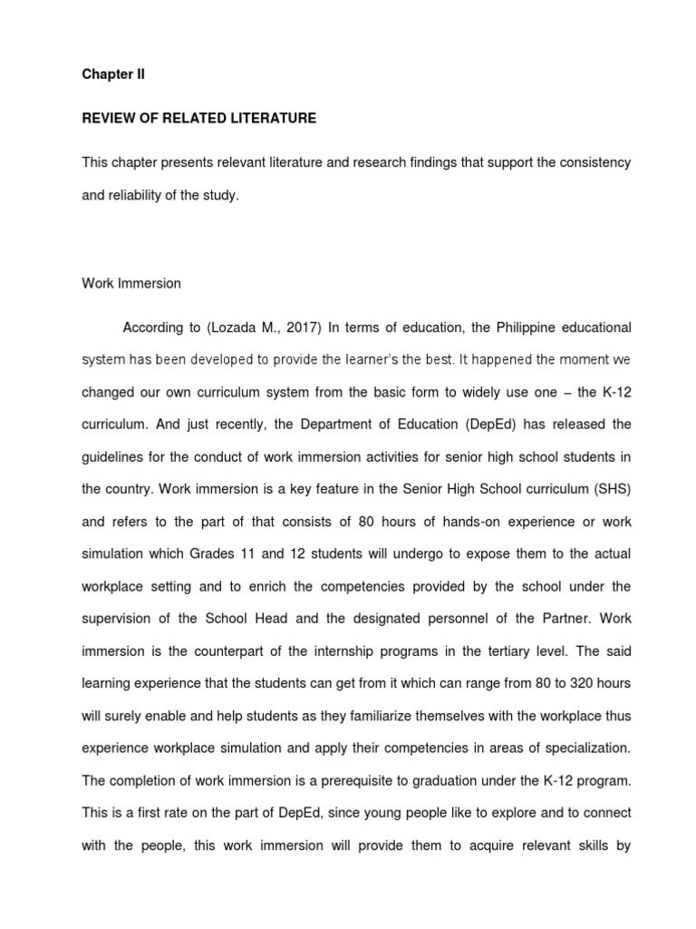 the country. Work immersion is a key feature in the Senior High School curriculum (SHS)