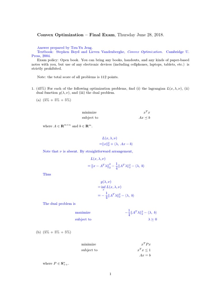 Convex Optimization – Final Exam, Thursday June 28, 2018.
