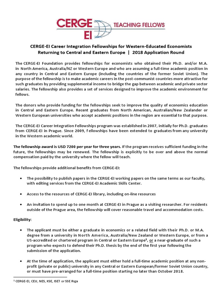 The CERGE-EI Foundation provides fellowships for economists who obtained their Ph.D. and/or M.A.