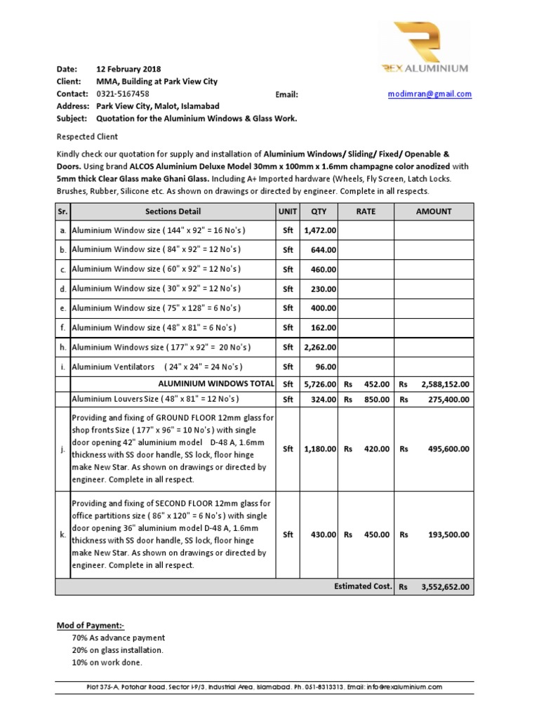 Subject: Quotation for the Aluminium Windows & Glass Work.