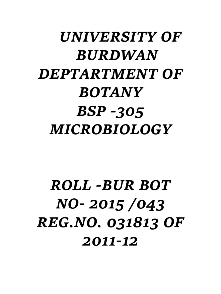 This document appears to be from a university department, specifically the Department of Botany at the University of Burdwan. It relates to a student with the roll number BUR BOT 2015/043 and registration number 031813 of the 2011-2012 school year, taking the course BSP-305 which relates to microbiology.