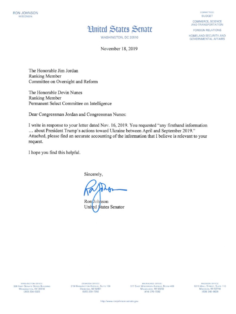 Senator Ron Johnson sends a letter to HPSCI Ranking Member Devin Nunes outlining issues with Lt. Col. Alexander Vindman who is a member of the White House National Security Council.