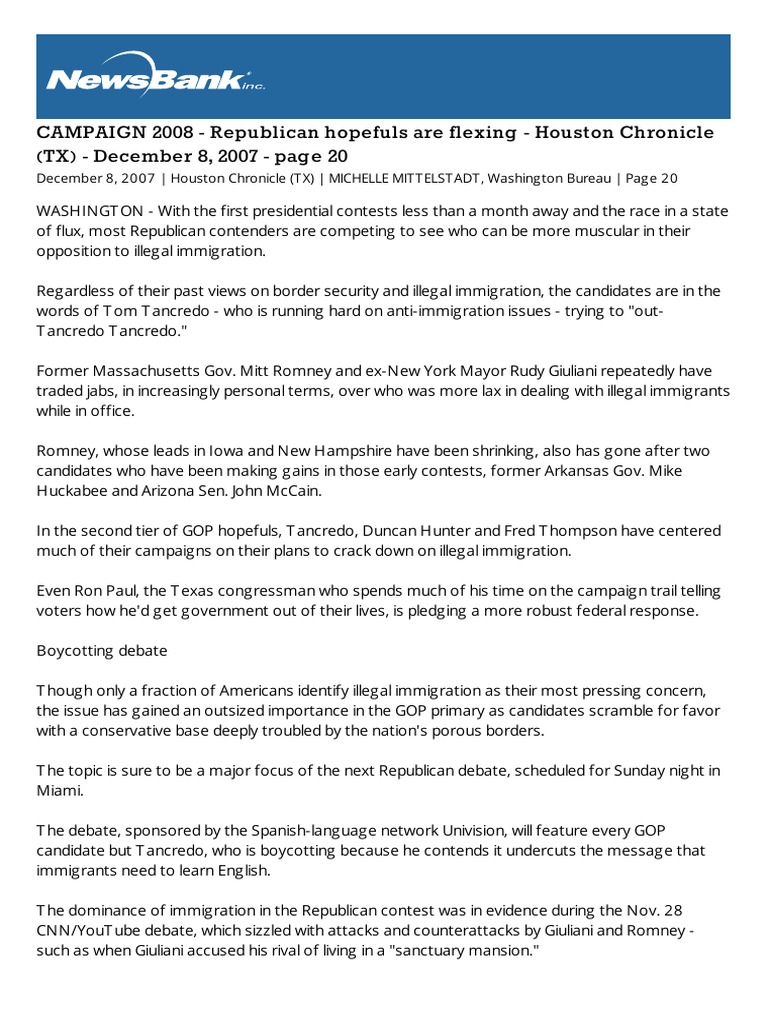 CAMPAIGN 2008 Republican Hopefuls Are Flexing Houston Chronicle TX December 8 2007 p20