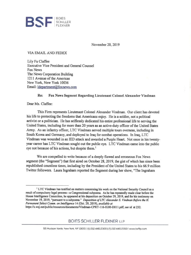 Letter From Lt. Col. Vindman's Lawyers To Fox News