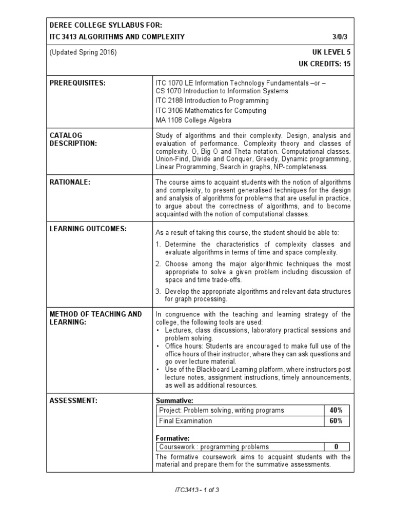 ITC 3413 ALGORITHMS AND COMPLEXITY 3/0/3