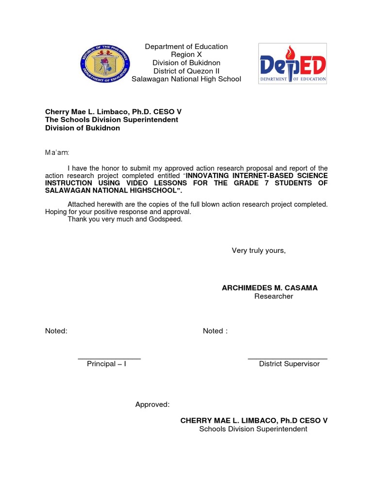 I have the honor to submit my approved action research proposal and report of the