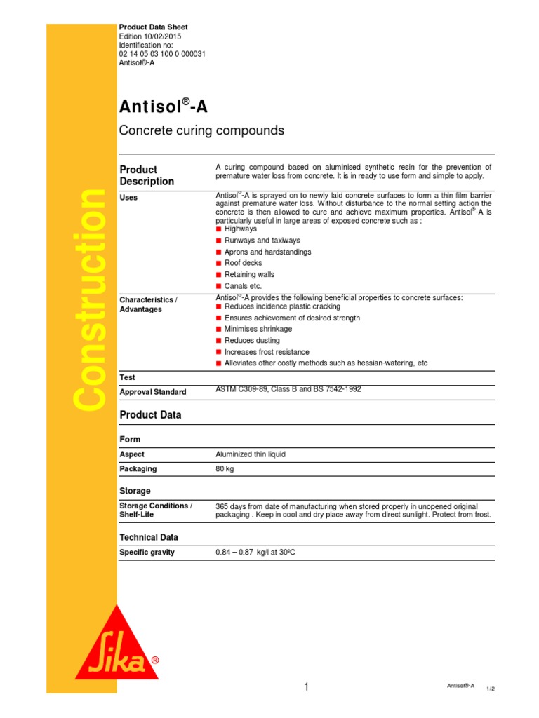 Uses Antisol -A is sprayed on to newly laid concrete surfaces to form a thin film barrier