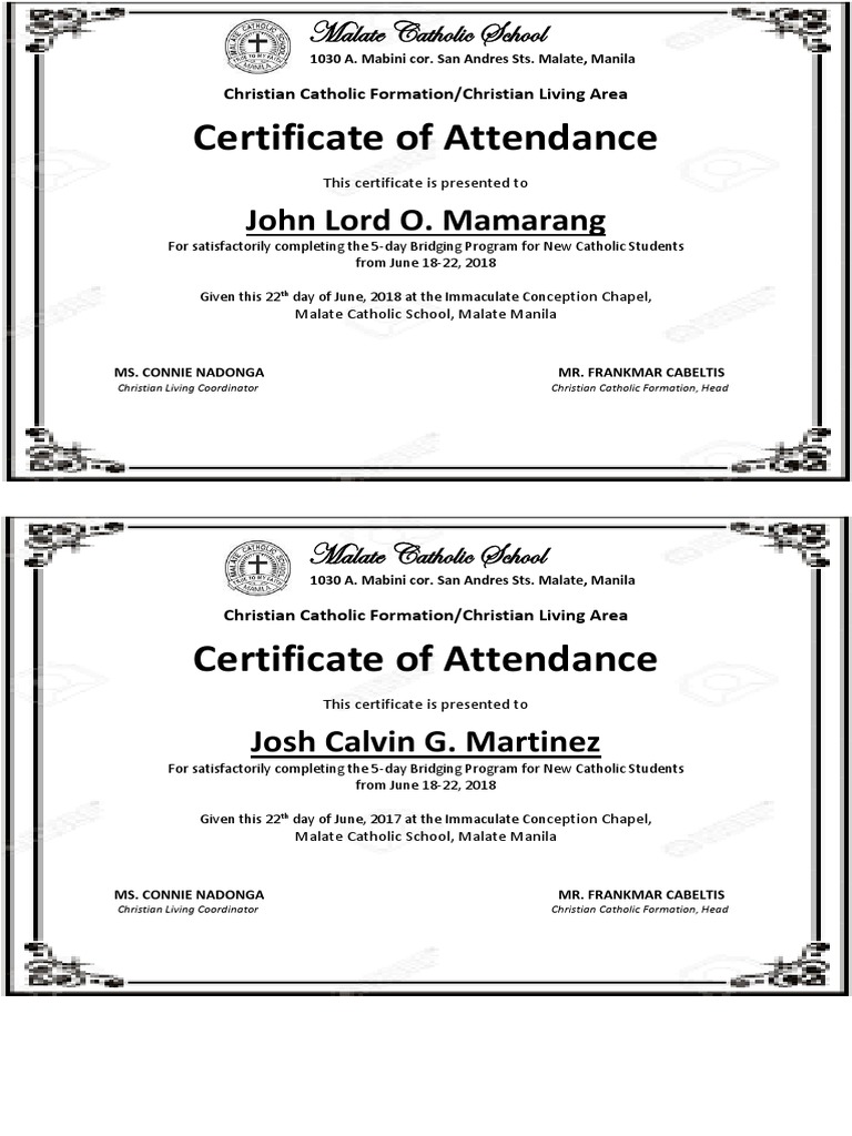 For satisfactorily completing the 5-day Bridging Program for New Catholic Students
