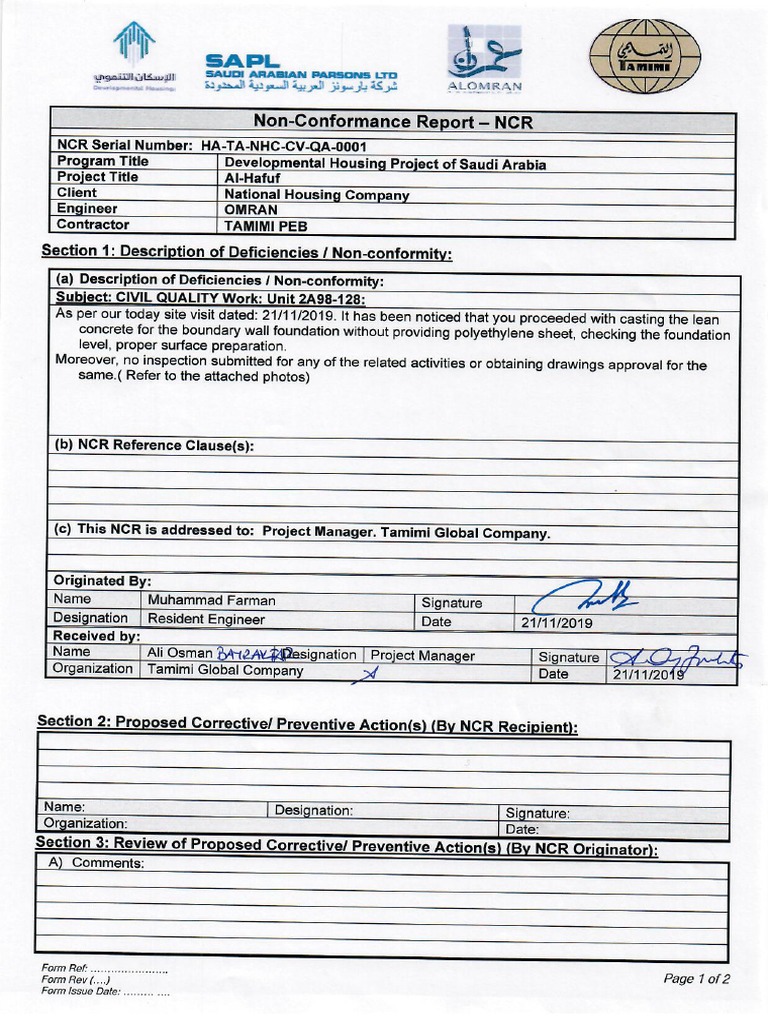 Form issue Date:Reference: NCR Serial Number: HA-TA-NHC-CV-QA-0001