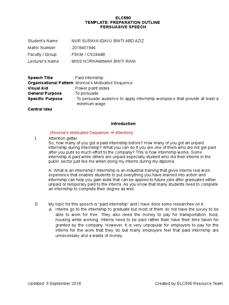 Specific Purpose : To persuade audience to apply internship workplace that provide at least a
