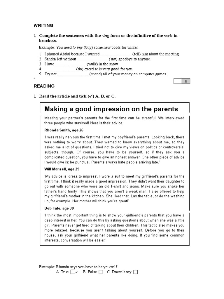 1 Complete the sentences with the -ing form or the infinitive of the verb in