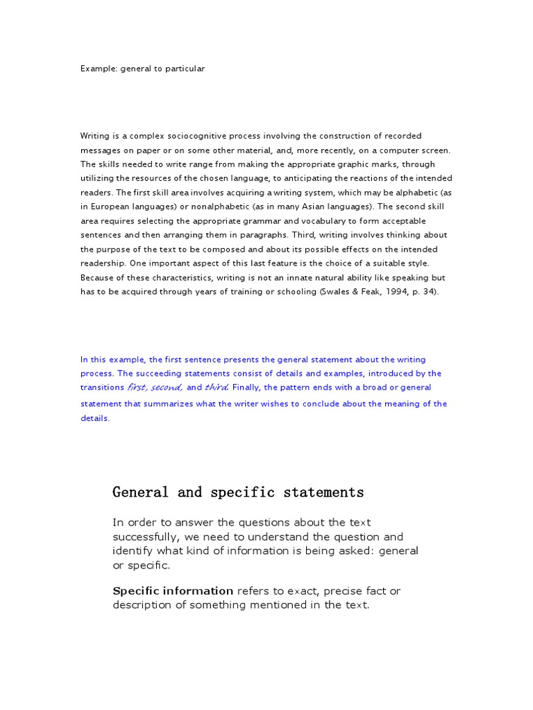In this example, the first sentence presents the general statement about the writing