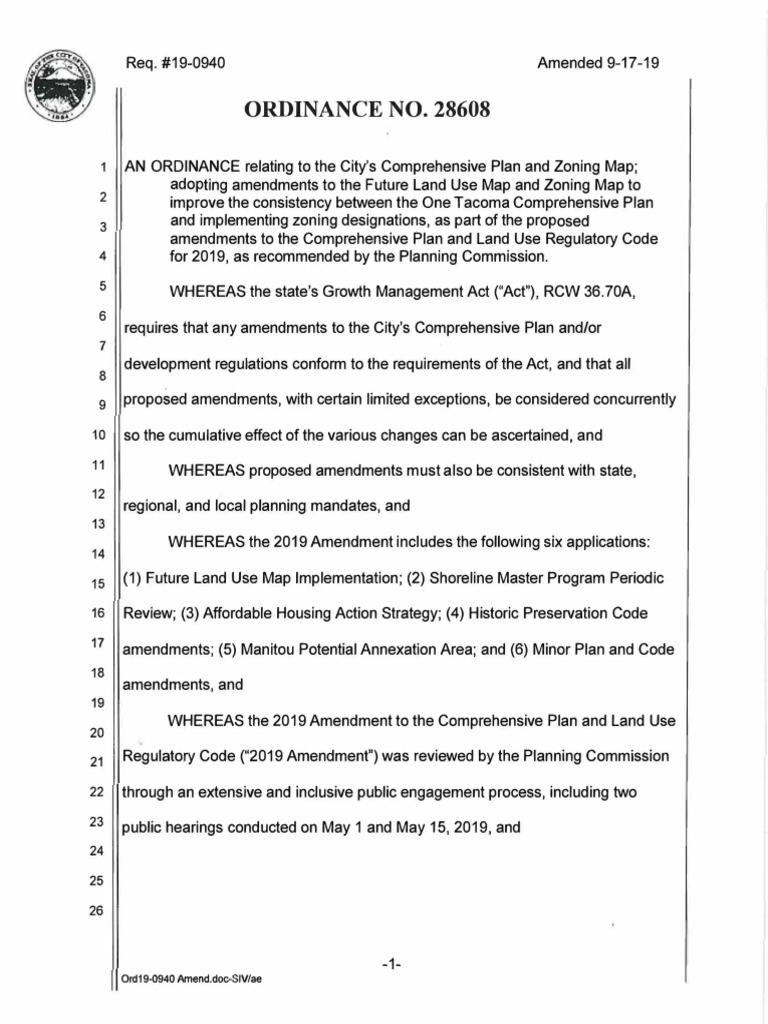 adopng aendments to the Futre Land Us Mp and Zong Map to improve he consstency beween he Oe Tacoma Compreesve la and mplementing zonng desgnato, s pa f te propose aendens to he Comprehensve Pln an Land Use Reglatory Cod fo 2019 s conded by the lanng Comsson. WHEREAS the staes Gowt Mnagement Act ("Act) RCW 36.70A, eques tat ay amendments o the Cys ompehensve Pan ad/or dvepen reguatons onform to he reurements of te Act and hat a ropoed aendmets wh ertain lmted xceptons, e onsdeed concurrently so te cmve eect o he vaos chages ca be ascertned and WHEREAS pr oosed amendmens must als be nsstet w tat, egonal and local png mandates and WHEREAS the 209 Amndment cdes the foowng sx aplcatos: 1)utue Lnd Use Map Impleentato (2) Shoelne Master ogra PeiodcRevew (3) Aordle ousng Aon Straegy; (4) Hisoc reservtio od amendents (5) Matou Potental Anexaon Area; ad (6) Mno Pla and Code amenmets and WEREAS the 2019 Amedmen to te Coprehensive Pla and and Use Reguoy Coe (09 Andme) was evwed by e Pannng Commsson hroug a exense a nclusive pubic egagemet poces icludng two pubi eangs conducted on May 1 and My 5 2019 ad