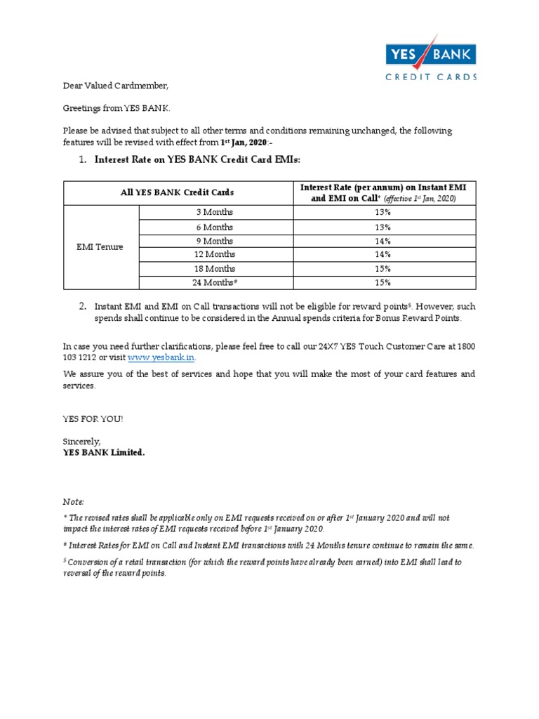 1. Interest Rate on YES BANK Credit Card EMIs: