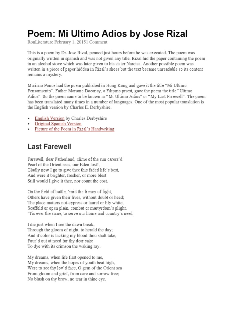 Adios”. So the poem came to be known as “Mi Ultimo Adios” or “My Last Farewell”. The poem
